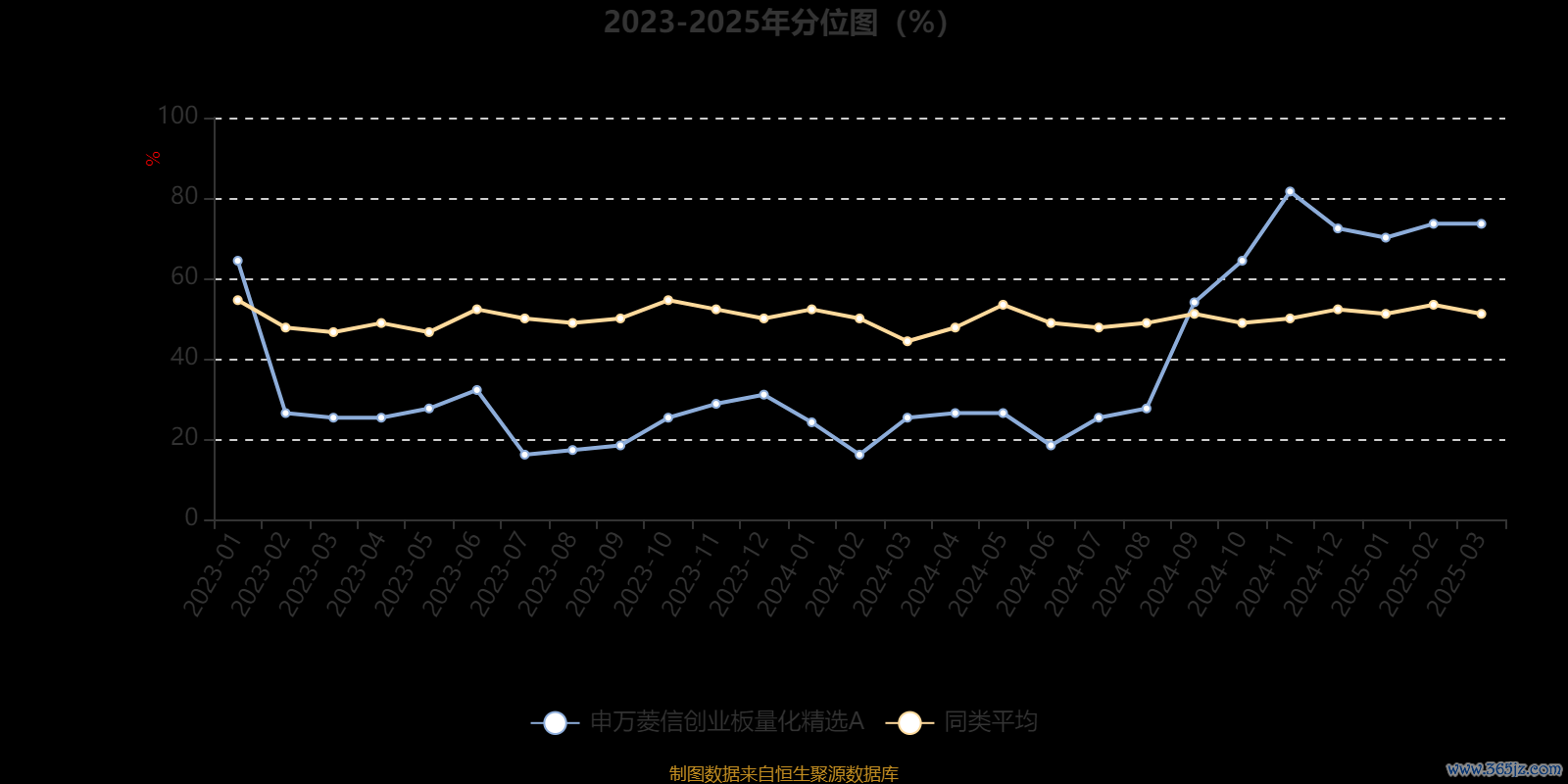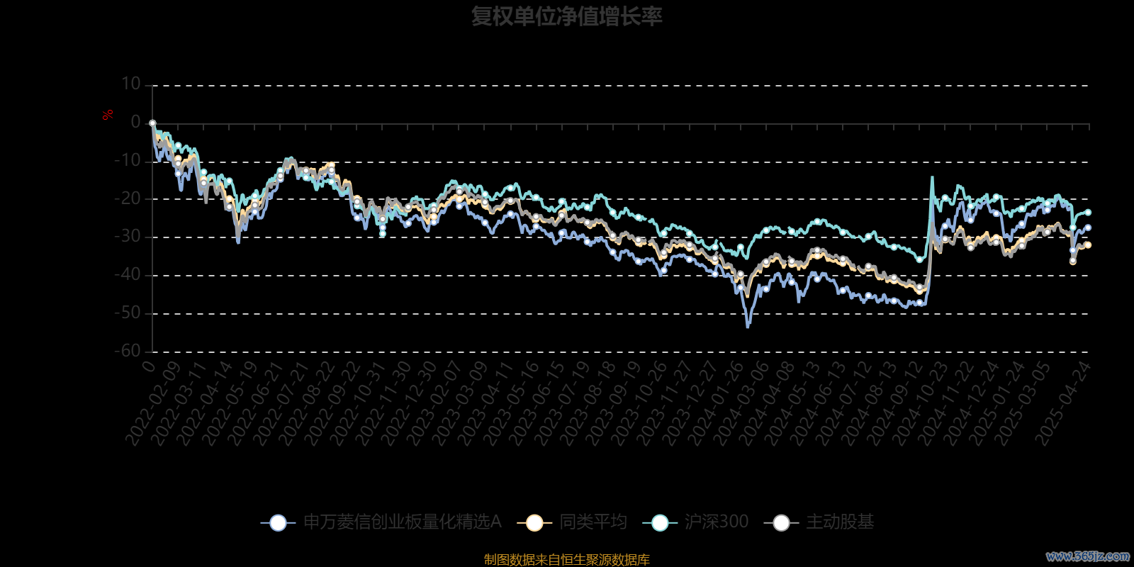 截至4月24日,申万菱信创业板量化精选A近三个月复权单位净值增长率为-1.35%,位于同类可比基金64/100;近半年复权单位净值增长率为0.07%,位于同类可比基金47/100;近一年复权单位净值增长率为28.72%,位于同类可比基金10/100;近三年复权单位净值增长率为-0.59%,位于同类可比基金26/77。