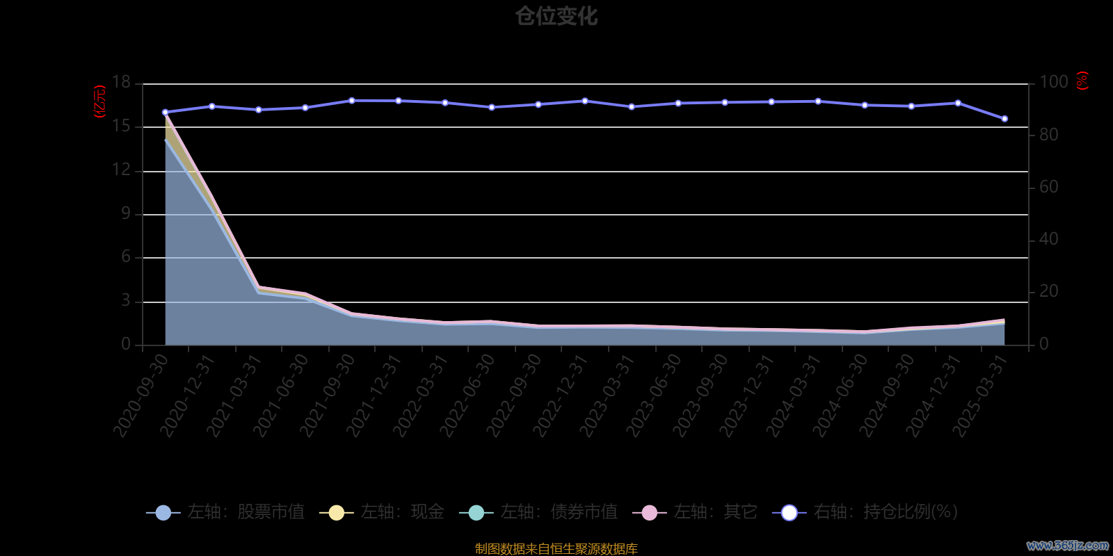 据定期报告数据统计,近三年平均股票仓位为91.71%,同类平均为88.14%。2021年三季度末基金达到93.44%的最高仓位,2025年一季度末最低,为86.5%。