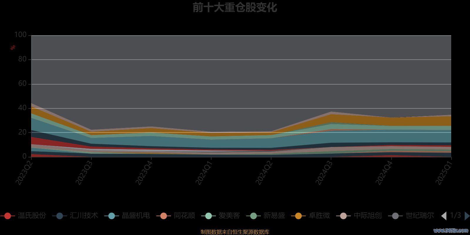 且持股标的较为稳定。截至2025年一季度末,基金十大重仓股分别是宁德时代、东方财富、汇川技术、迈瑞医疗、阳光电源、中际旭创、新易盛、亿纬锂能、爱尔眼科、同花顺。