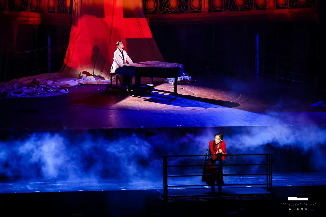 或许大多数观众在观看音乐剧之前都看过同名电影,这就不得不提到两者的不同。相比之下,电影《海上钢琴师》有不少场景和画面反映时代背景,比如移民潮与“美国梦”,画面的质感也让人时刻感受大时代的困境,虽然音乐剧《海上钢琴师》中也表述了战争对人类的伤害,但舞台的乌托邦属性削弱了现实感,营造出更为理想化的空间,让观众把视线集中在一位传奇的音乐天才身上,他在海洋上在漂泊中享受自由,飞蛾扑火般地追求所爱的音乐。