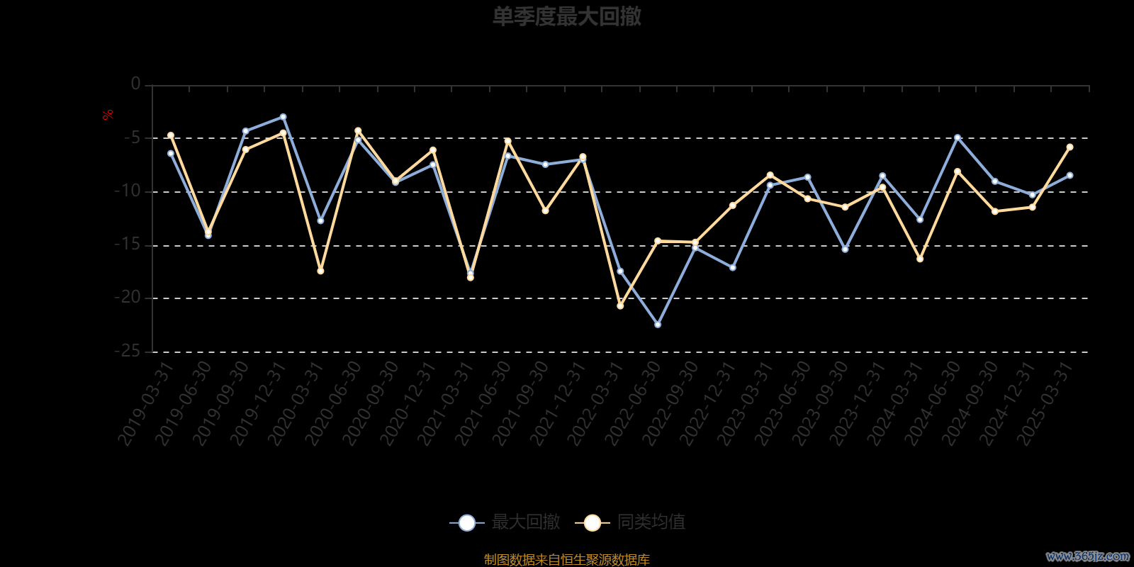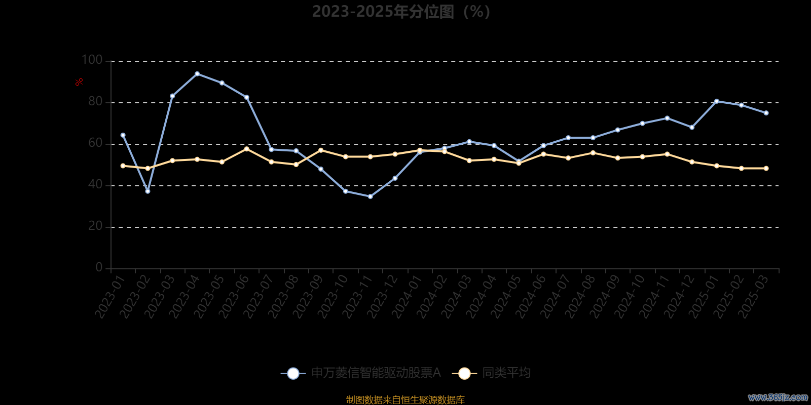 通过所选区间该基金净值增长率分位图,可以观察该基金与同类基金业绩比较情况。图为坐标原点到区间内某时点的净值增长率在同类基金中的分位数。